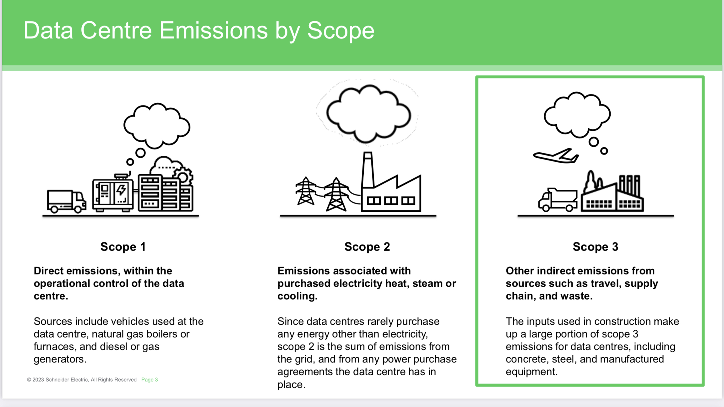 Scope 3 is usually described in the context of Scope 1 and Scope 2. These, respectively, are the direct emissions which result from the data centre operations and its GHG emission output resulting from consumption of electricity from non-renewable energy sources.