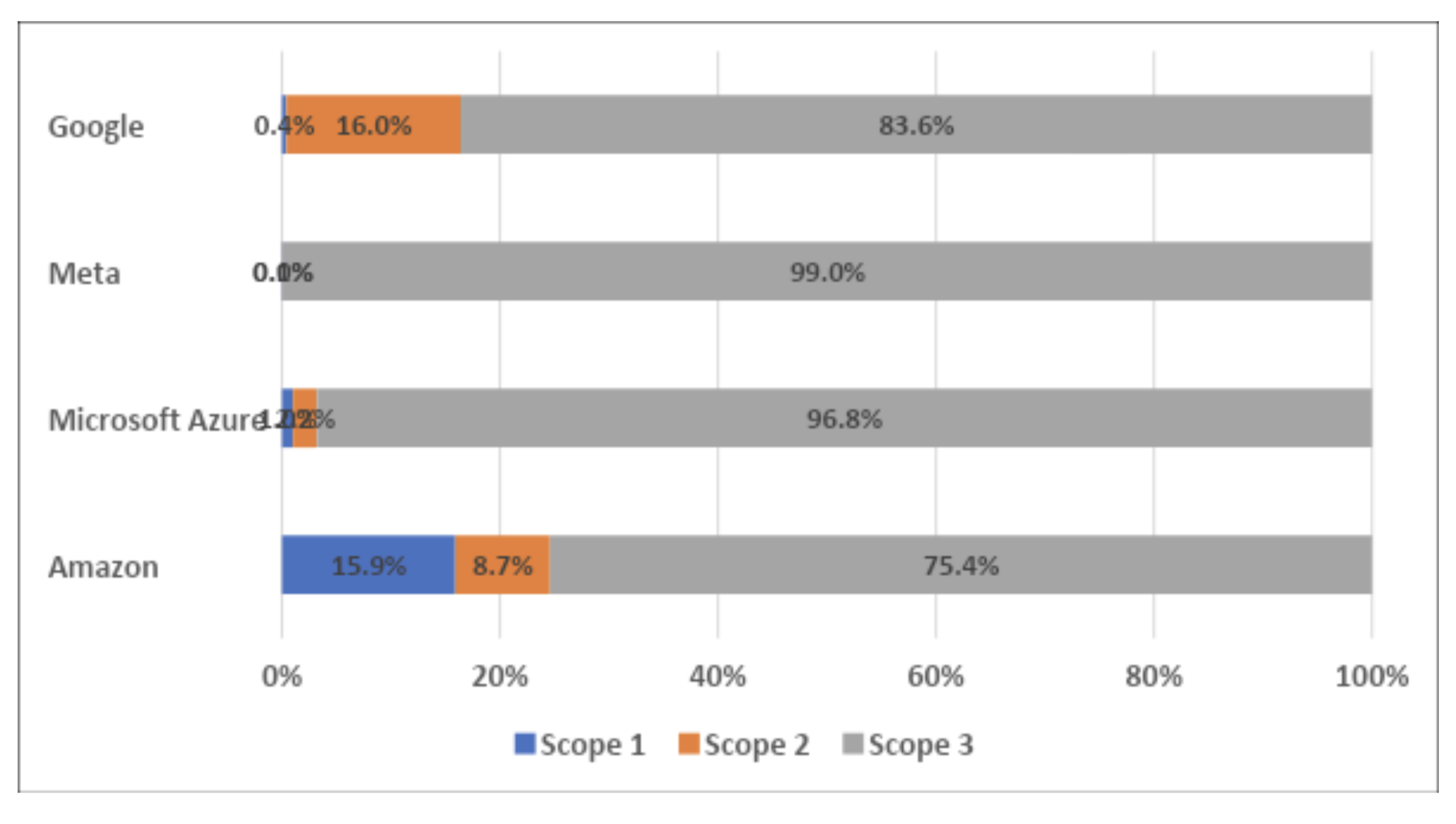 The example of the major cloud players indicates that a high majority of their carbon emissions now derive from Scope 3: 75.4% for Amazon Web Services 96.8% for Microsoft Azure; 83.6% for Google and 99% for Meta.